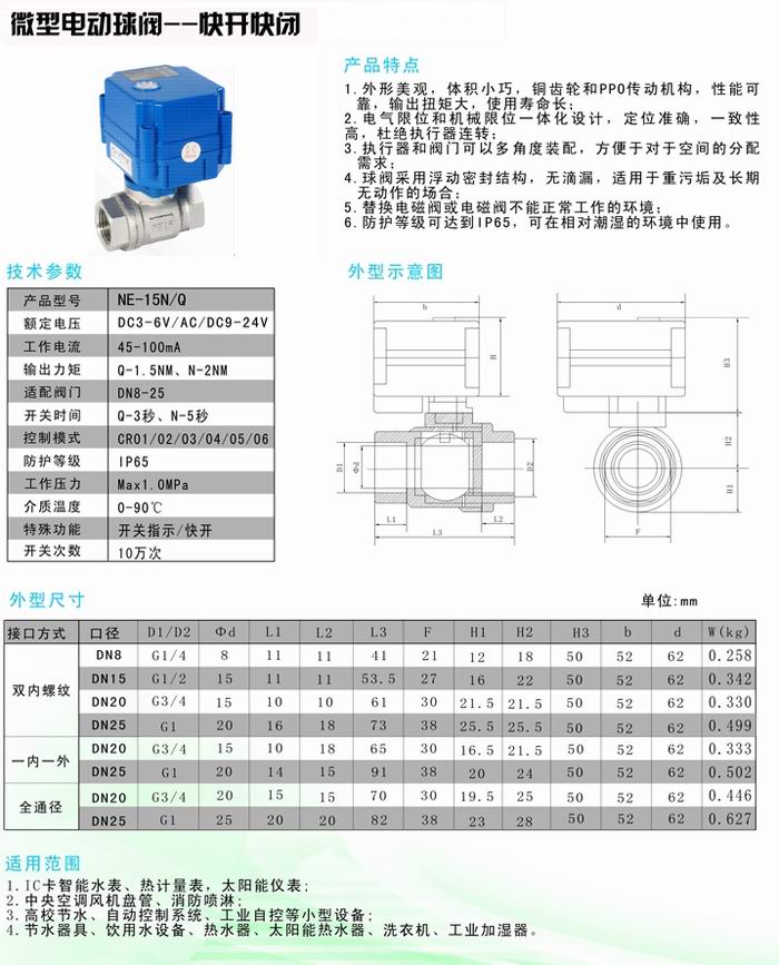 微型電動(dòng)球閥是萊克公司的超小型電動(dòng)閥門(mén)品種,其執(zhí)行器和閥體的一體化設(shè)計(jì),極大地減小了外形體積,為在儀器儀表及小型設(shè)備上的使用提供了方便。閥球、閥桿采用浮動(dòng)密封結(jié)構(gòu),既減小了扭力又克服了結(jié)垢導(dǎo)致開(kāi)關(guān)不靈的弊病。用戶(hù)可選配帶手動(dòng)和不帶手動(dòng)的品種,執(zhí)行器的顏色以及閥體材質(zhì)、控制方式有多種選擇,額定電壓:DC:5、12V,DC/AC:9-24、110、220V。微型電動(dòng)球閥廣泛應(yīng)用于暖通、空調(diào)、水處理等各類(lèi)流體控制設(shè)