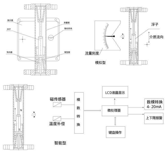 流量計(jì)主要有三大部分組成:1.測(cè)量管體;2.錐形浮子;3.指示器。浮子的位移量與流量大小成正比,通過(guò)磁耦合系統(tǒng),以不接觸方式,將浮子位移量傳給指示器指出流量大小。也可配合不同的轉(zhuǎn)換器,將流量值轉(zhuǎn)換成標(biāo)準(zhǔn)的電遠(yuǎn)傳信號(hào)如4-20mA。實(shí)現(xiàn)距離遠(yuǎn)傳顯示、記錄、積算和控制等功能。