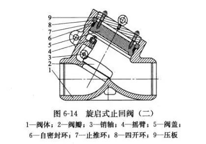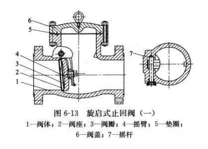 01單瓣式(圖6-11)只有一個(gè)閥座通道和一個(gè)閥瓣,適用于中等口徑旋啟式止回閥。